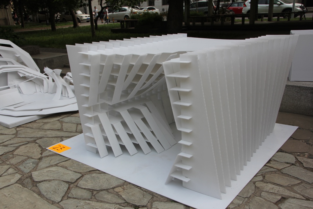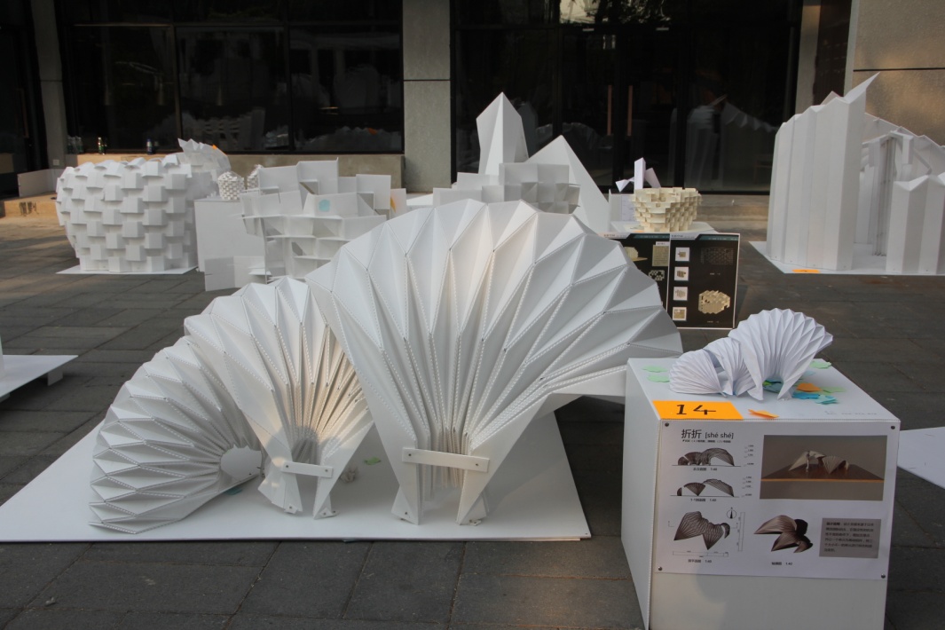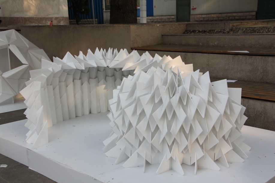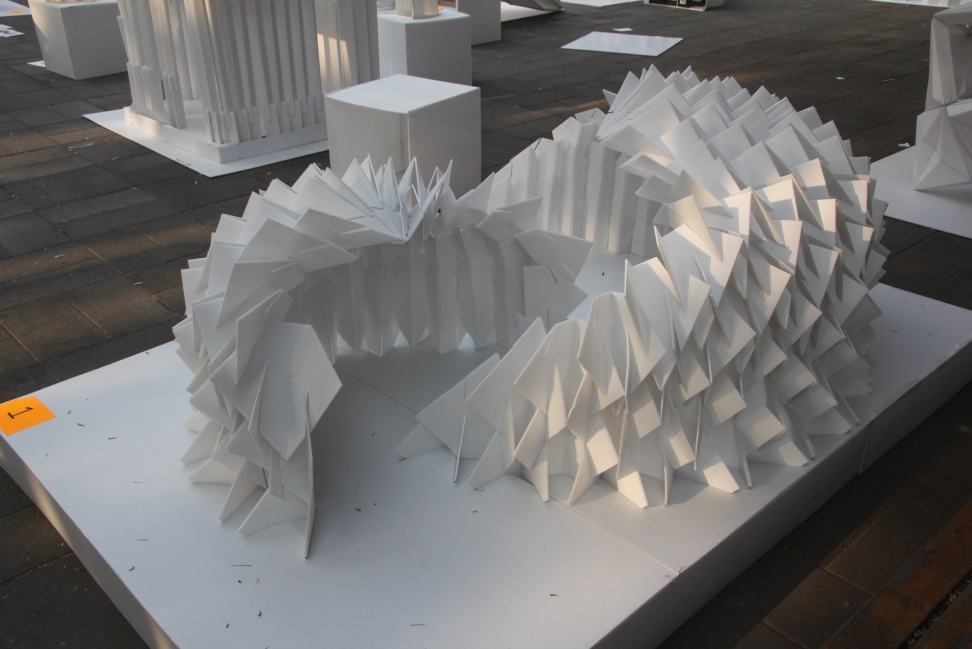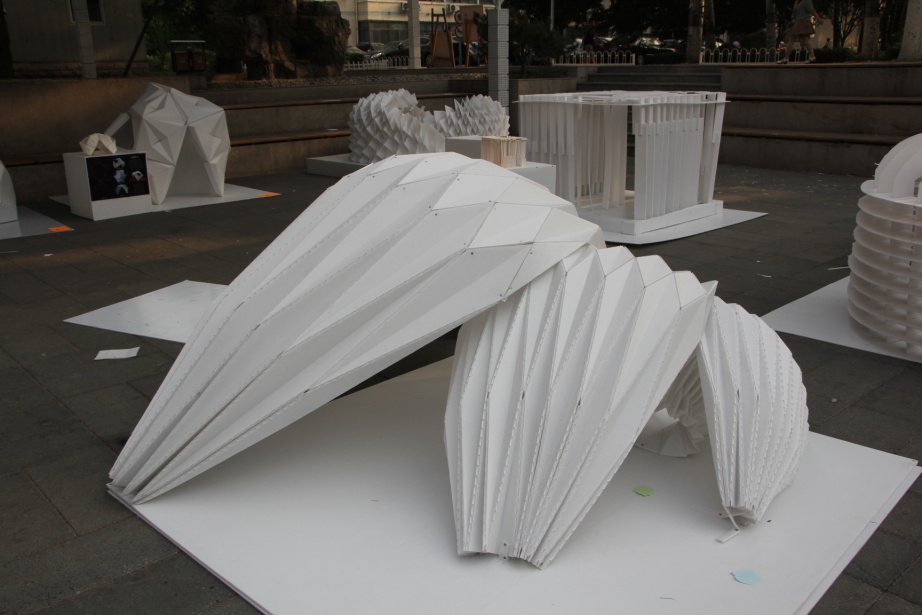 “折折”是本屆建造節的一等獎,設計靈感來源於日本橫濱國際碼頭,造型獨特的模型吸引了眾多人的眼光。不同於別的小組拚接方式,該設計最大的亮點在於結合材料特性,是唯一運用整板折疊而成的設計。查閱資料,小組成員計劃在穩定性和抗壓性不變的條件下,增加支撐點,並以一個單元為基礎組件,將三個大小不一的單元進行拚合和適當的變形,在下沉廣場,“折折”成了一道獨特的風景線。