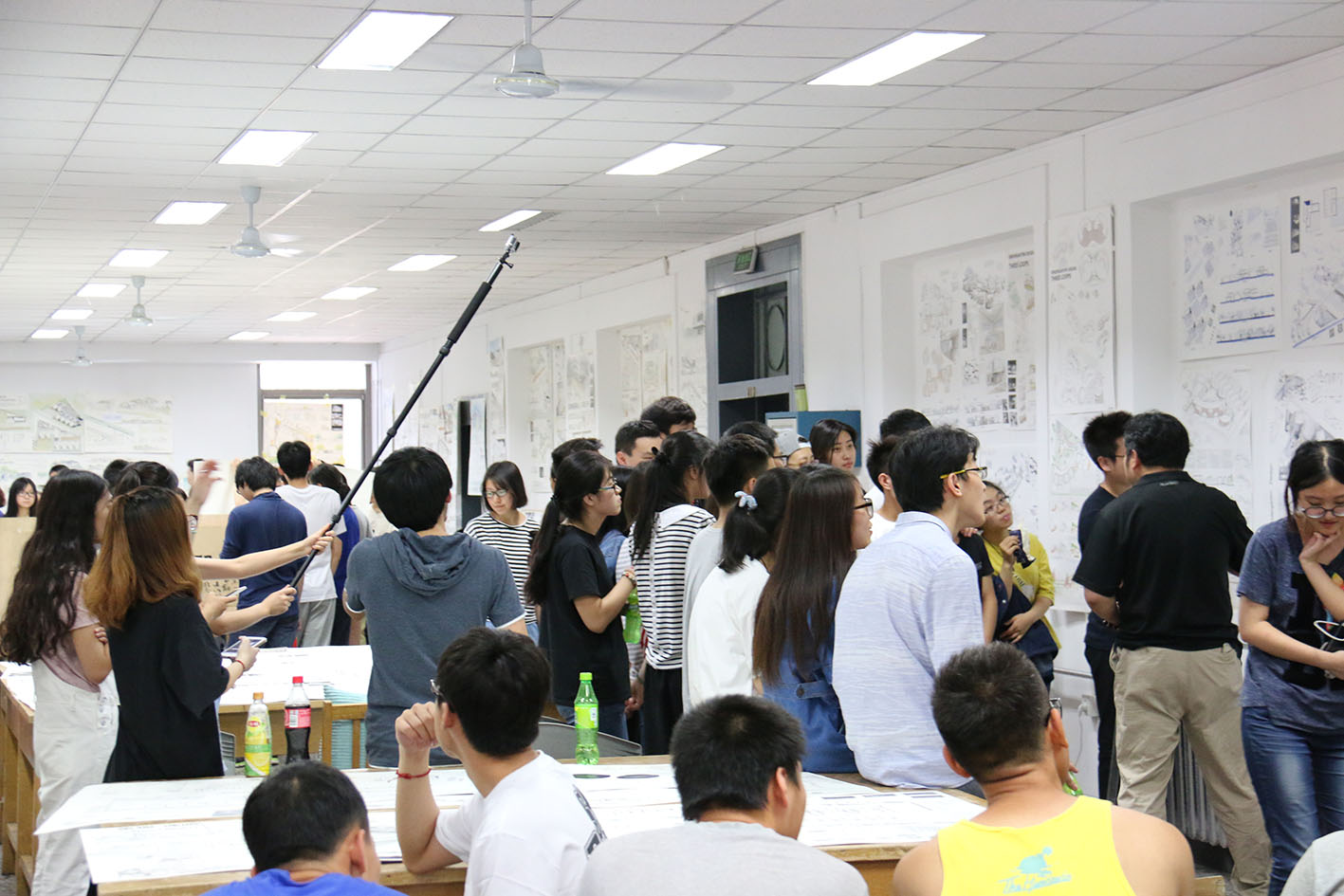 為了更好的記錄建院學子的作業成果,提高評圖的效率,學院特別組織三位研究生操作航拍飛機、gopro4、Mark111等設備,使用無人航拍技術,全方位立體的展現建院學子的手繪成果、鋼筆排線、水彩渲染、噴筆繪圖、3D打印等作業效果,師生互動頻繁,現場氣氛十分熱烈。
