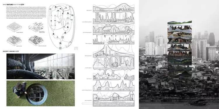 馬尼拉(菲律賓首都)由於巨大的人口,每天都會產生大量的有機垃圾。這些垃圾將成為新的垂直工廠的資源。所有的廢料都會傾倒在工廠的底層,然後被提取出有價值的產品——水、肥料、熱能和電力。我們再用這些產品去打造不同的自然環境。景觀是根據工廠的規模和形態進行塑造。有機垃圾之後就會被轉變成新的城市景觀,從而讓工廠藏於自然的景觀層次之下。本設計的主要概念是讓人們意識到自然環境是一種循環,人們生產出的任何產品都將塑造出一片新世界。與其詬病汙染問題,不如讓我們創造一種理想的方式,讓人們能夠理解什麼才是人與自然的最好互動。