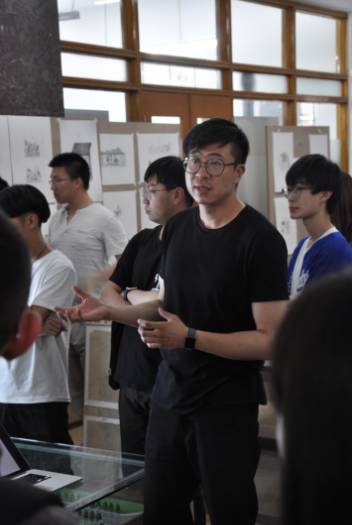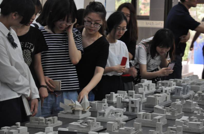 5月8日下午15時,在西城校區圖書館一層大廳的桌麵上擺滿了學生製作的混凝土模型,周圍展板上的水墨渲染圖紙看上去充滿著意境。