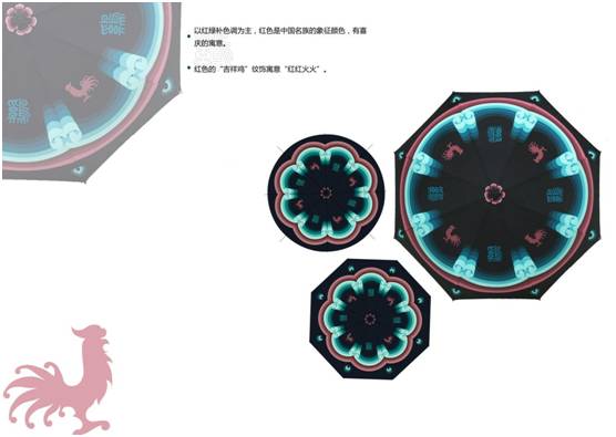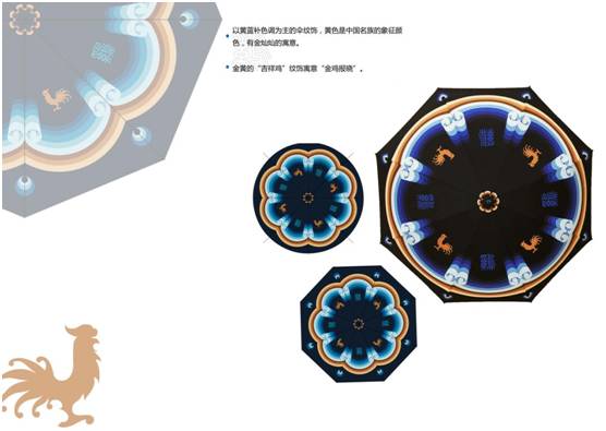 他說著拿出兩把造型精美的傘展示給我們看,這是團隊成員李欣學姐所做的一套已經成型的文創產品。傘的紋飾運用古建彩畫的“包袱”作為設計元素,包袱彩畫的包袱心內容以“吉祥雞”紋飾與篆體書寫的“雞”字交替共同組成8骨傘,紋飾指向和色彩等設計都帶有獨特的美好寓意,如“四季平安”、“金雞報曉”。他們帶著這套產品參加了一個關於雞年生肖的文創競賽。盡管隻入圍了初賽,通過這次經曆,他們發現中國的文創產品擁有廣闊的市場,關鍵在於如何把消費和創意合理結合。