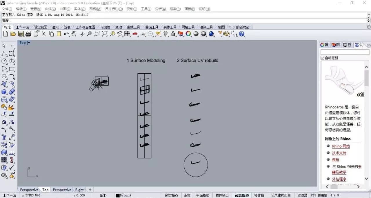 首先,賓大大牛給我們進行了自我介紹。大牛畢業於賓夕法尼亞建築係,對軟件有著濃厚的興趣,並在大三自學軟件。大牛強調了軟件對於建築的重要性,向我們說明現代建築的狀況,並提到了建築造型地位的日漸提高。在介紹了公司的幾個作品之後,大牛充分肯定了著名建築師紮哈開創不規則建築造型先河的精神。隨後,大牛向我們展示了如何用rhino快速建模,以及快捷鍵的使用。