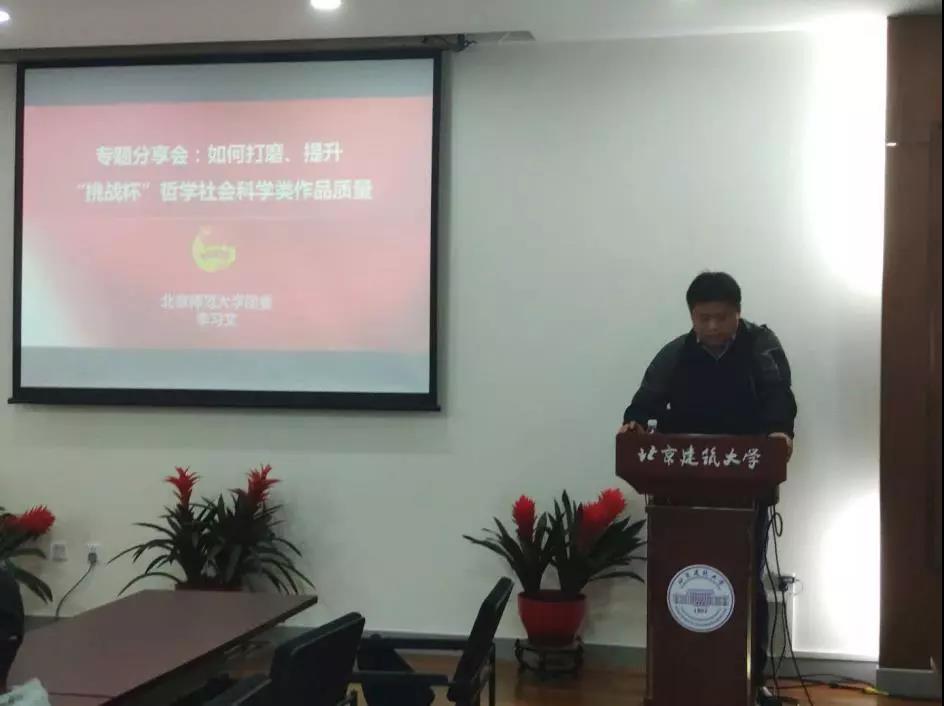 為了使同學們更加清楚挑戰杯的比賽事宜,更有針對性的完善自己的作品。在校團委的支持下,4月8日中午,北京師範大學團委助理、第九屆“挑戰杯”首都賽(2017年)組委會副秘書長李習文老師來到我校西城校區,舉辦專題培訓,為我校參賽的本、碩學生團隊展開專題指導。