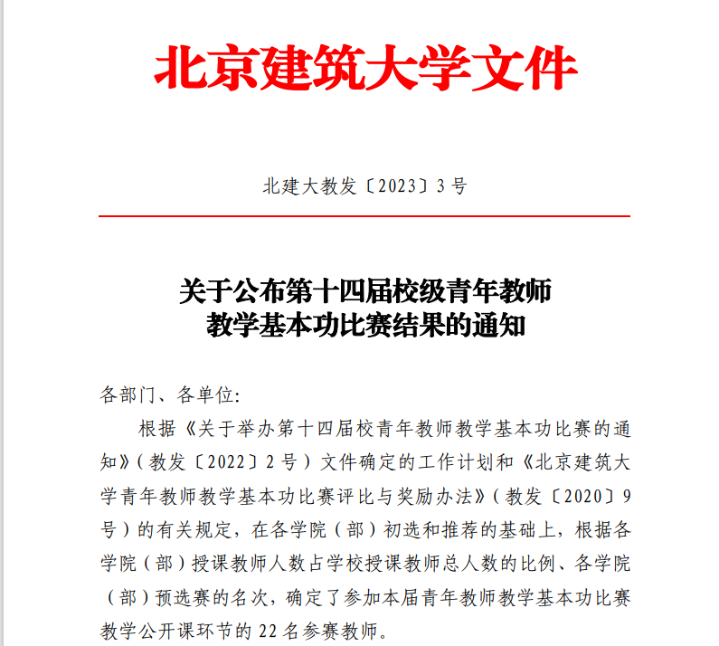 根據學校“關於公布第十四屆校級青年教師教學基本功比賽結果的通知”(北建大教發〔2023〕3 號),泛亞電競app下載4名參賽教師分別獲得比賽一、二、三等獎。其中,風景園林係李露老師獲得一等獎、最受學生歡迎獎、最佳教學演示獎;城鄉規劃係張穎異老師、建築技術部徐躍家老師獲得二等獎、建築係賈園老師獲得三等獎。這次獲獎再次展現了我院青年教師的教學風采和水平。