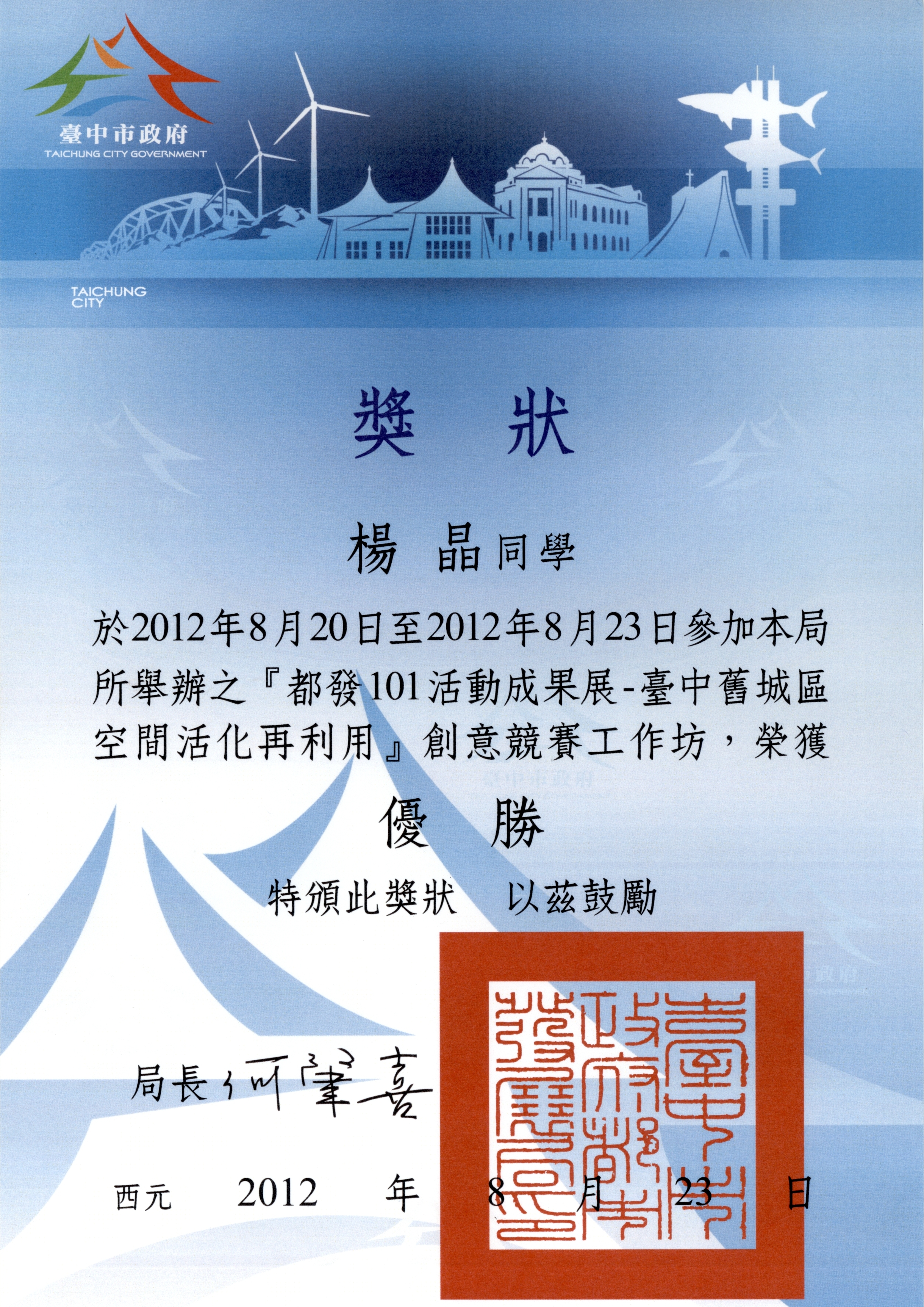此階段參與學員對台中市舊市區之城市議題進行研究,並對指定之基地做深度的閱讀,且針對綠能都市、設計都市、友善都市之可能型態進行研究與分析。工作坊的舉辦型式結合了專題講座、設計操作、設計評圖及成果發表會等形式,活動安排得既豐富又有趣。在專業老師的悉心指導下,我校參賽研究生均取得優異成績,其中建研11-3班的楊晶榮獲優勝獎,方文雄、劉曉忱榮獲佳作獎。兩岸師生不但在學術上有了深入的交流,也結下了深厚的友誼。