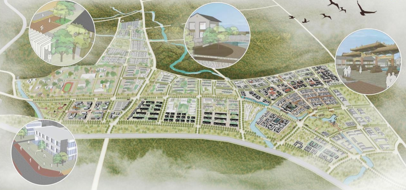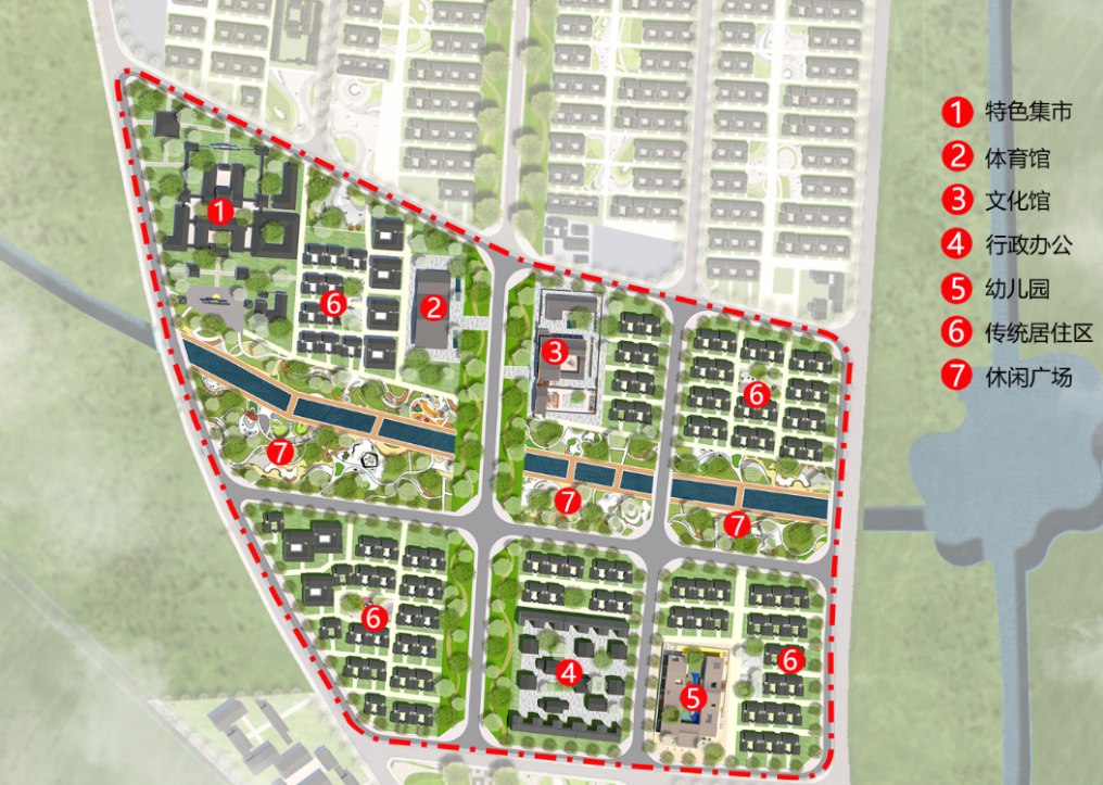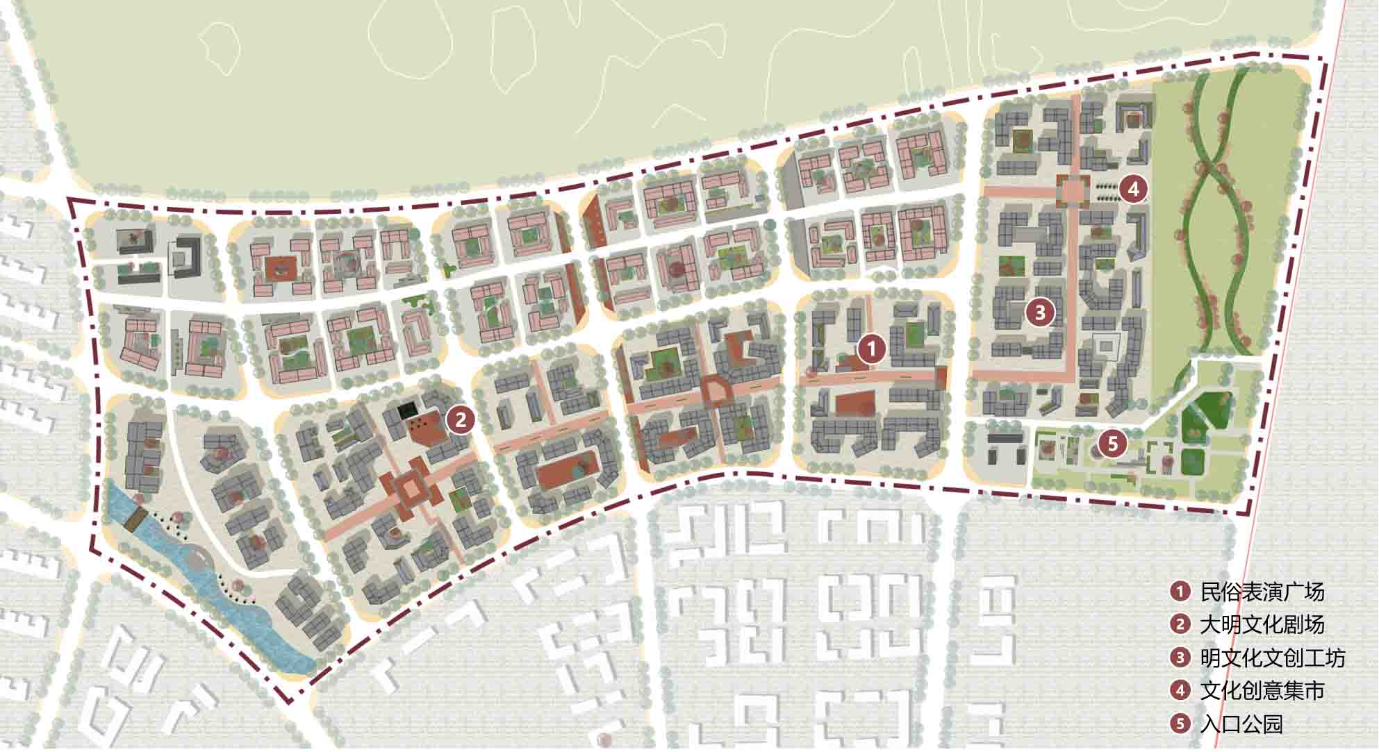 傳統風貌住宅區區主要通過明文化敘事和悠閑旅遊文化敘事兩條線路展開,用地麵積:20.26公頃,將明文化要素融入景觀設計,通過景觀小品、廣場和棧道等來展現明文化,營造更加濃厚的傳統文化氛圍。通過濱水廊道和綠色廊道兩大景觀向街區內部滲透的方式和片區綠心的設計,來提高街區整體綠地覆蓋率,提升居住區的環境品質。