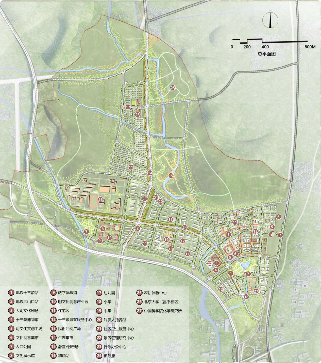 詳細設計地段位於總體設計地塊的南部,緊鄰現狀保留的北京大學昌平校區。總用地麵積約26.1公頃,以文創和居住用地為主,通過“生態+生產+生活”三大片區設計,結合場地科研文化資源,打造明文化與現代文化相結合的,以服務新村民為導向的文化產業園區,成為十三陵門戶區重要的科教片區。